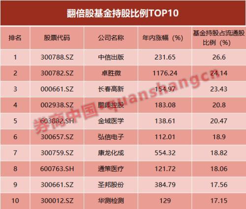 据统计,在上述257只年内翻倍的个股中,公募基金持股占流通股比例超过15%的共有19只。中信出版以26.6%的基金持股占比排名第一,该公司股价年内涨幅高达231.65%,其他排名前十的还有卓胜微、长春高新等公司。
