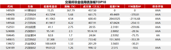 交易所债券市场收盘,据Choice 数据统计显示,今日交易所市场非金信用债涨幅排行前五的分别是:H1碧地02、21万科04、23万科01、21万科06、20当阳债。具体如下: