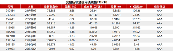 据Choice 数据统计显示,今日交易所市场非金信用债跌幅排行前五的分别是:24产融02、24产融04、20宁国债、23产融06、23产融08。具体如下: