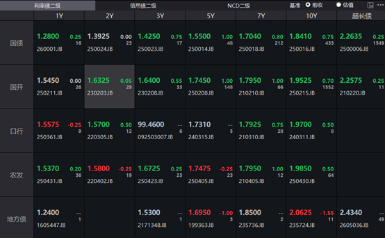 银行间主要利率债收益率多数上行,截至下午16:30分,10年期国债活跃券250016收益率上行0.75bp报1.841%,10年期国开债活跃券250215收益率上行0.7bp至1.9525%,30年期国债活跃券2500006收益率上行0.25bp至2.2635%。