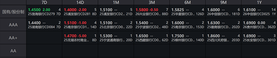 一级存单方面,今日3M国股在1.55%-1.58%位置需求较好,1Y期国股报在1.59%-1.62%的位置。二级存单方面,6M国股成交在1.5825%附近(较前一日下行1.75BP),1Y国股成交在1.6100%的位置(较前一日变化不大)。