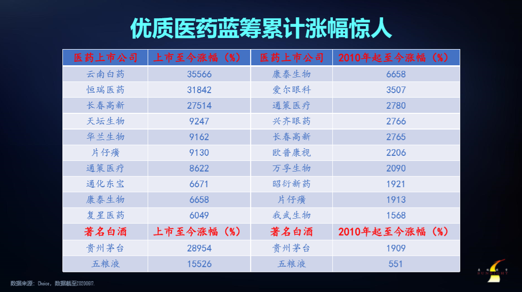 森瑞投资董事长林存表示,医药股在过去二十年一直是成长白马股最多的摇篮。以过去十年涨幅来看,前三名累积涨幅都是300倍左右的水平,云南白药上涨了356倍,恒瑞医药上涨了318倍,长春高新涨了275倍,完全可以和茅台媲美。