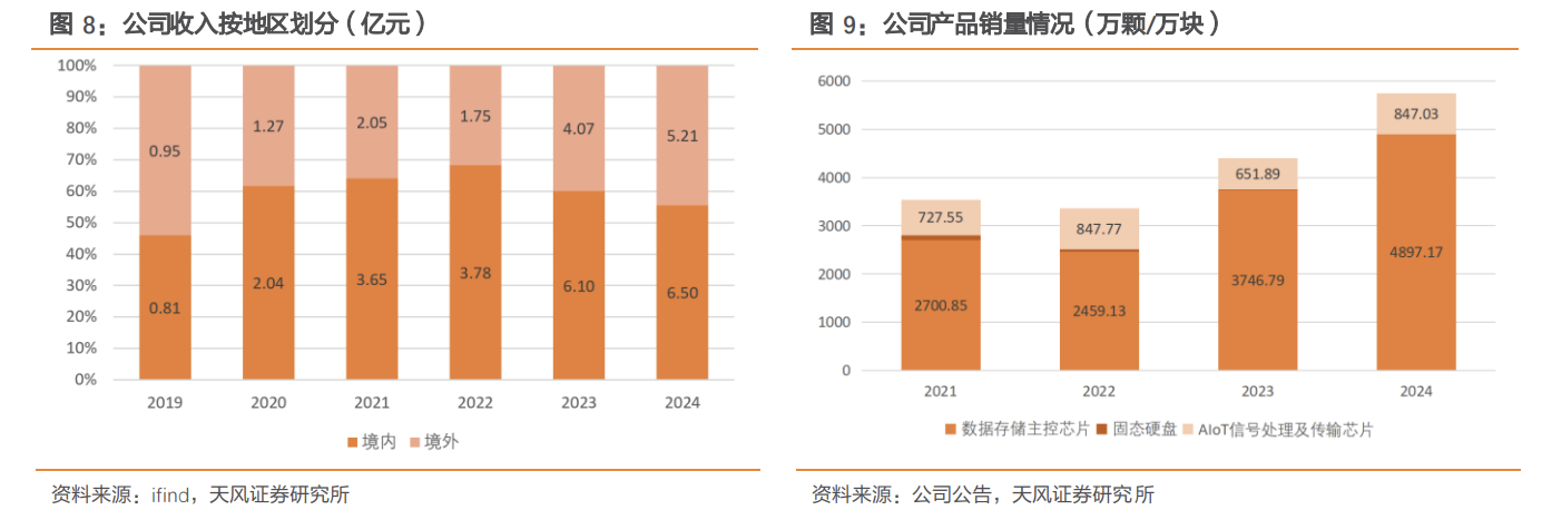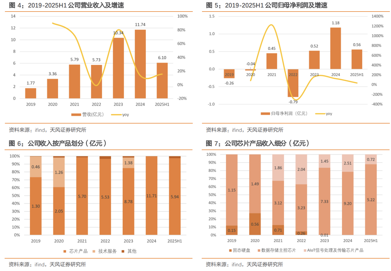 数据存储主控芯片:这是公司当前收入占比最大、毛利率最高的业务板块。该业务主要包括固态硬盘(SSD)主控芯片和嵌入式存储(如UFS)主控芯片。公司产品已实现从SATA到PCIe5.0的全协议覆盖,广泛应用于消费级、工业级和企业级市场。2024年,该业务实现收入9.20亿元,同比增长25.42%,毛利率高达54.04%。