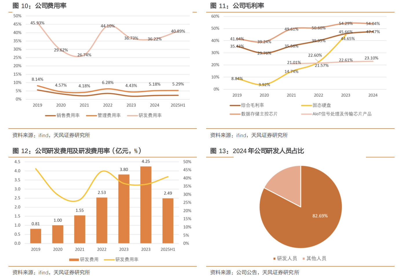 持续高研发投入铸就壁垒,深度绑定核心客户。公司研发费用率长期保持在36%-38%(行业领先),2024年研发投入4.25亿元,研发人员占比82.69%。通过平台化开发、AgileECC、NPU指令集等核心技术积累,公司构建了深厚的技术护城河,并绑定长江存储、江波龙等头部客户,形成稳定的订单转化能力。
