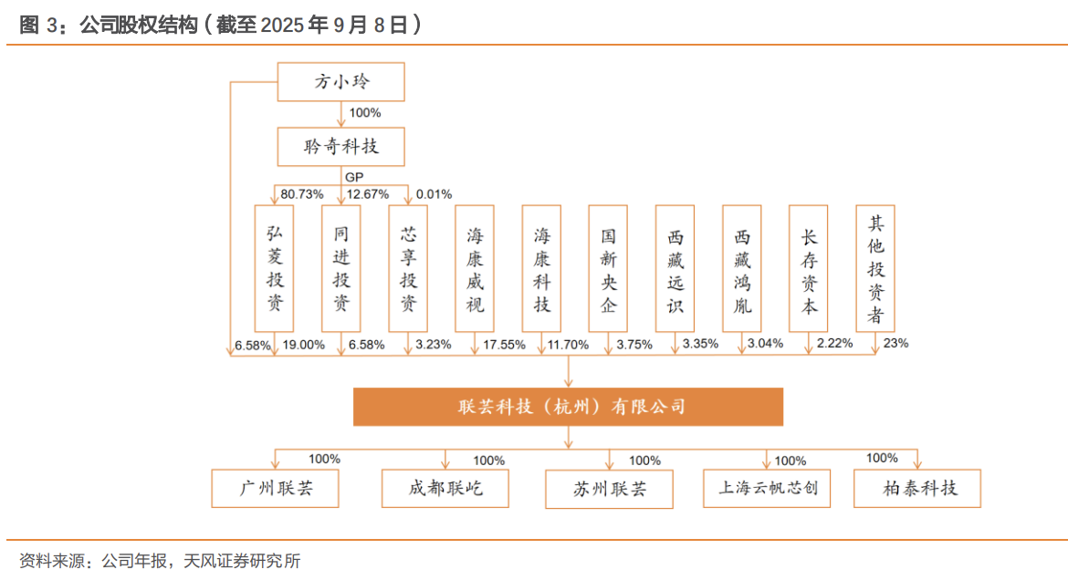 公司股权结构较为集中,股权结构清晰。截至2025年9月8日,实际控制人方小玲直接持有公司6.58%股份,并通过全资控股聆奇科技成为弘菱投资、同进投资和芯享投资普通合伙人(GP),间接持有公司股份,形成绝对控制权。联芸科技下设广州联芸、成都联屹、苏州联芸、柏泰科技、上海云帆芯创五家全资子公司,布局技术研发和产品销售。