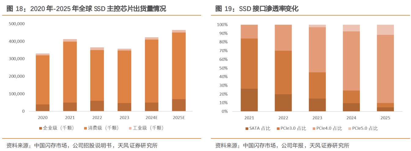 SSD主控芯片出货呈上升趋势。2024年,随着生成式AI浪潮席卷全球,企业级数据中心市场迎来需求复苏,PC及消费类市场尽管相对温和,但同样处于上扬态势。根据CFM闪存市场数据,2024年全球SSD主控市场共出货约3.885亿颗,相较2023年增长8%。按照SSD接口渗透率变化看,2024年全球PC前装市场搭载的SSD模组主力依旧为PCIe4.0,相较2023年,PCIe5.0接口SSD产品已在PC前装市场获得一定数量的商用,2025年这一比例将快速提升。