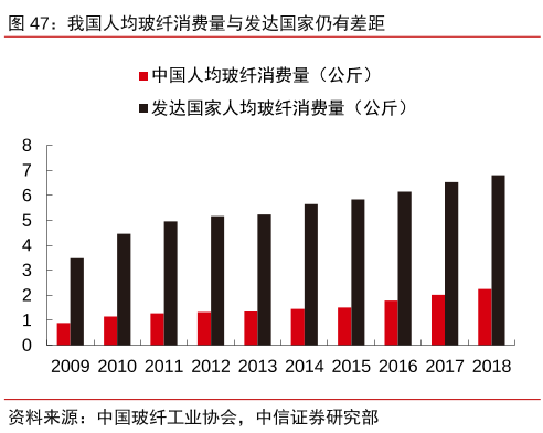 长远来看我国目前人均玻纤消费量和发达国家仍有不小的差距,就以汽车行业举例,目前国产车玻纤及复合材料应用比例只有8-12%,远低于发达国家的20-30%。