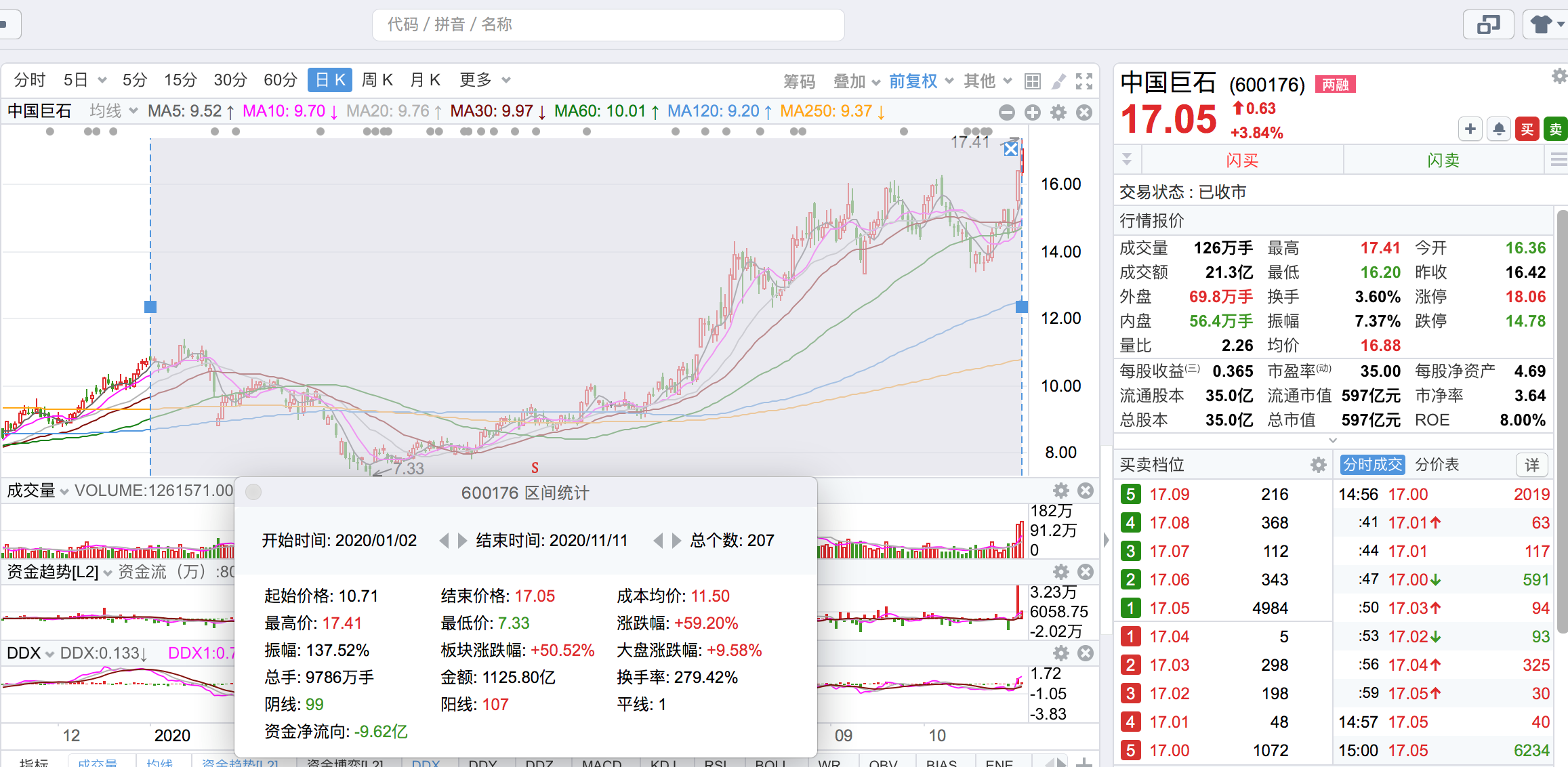 11月11日,盘中再创历史新高17.41元/股,和年初相比涨幅已经高达59.2%。