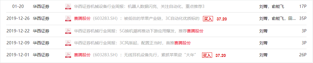 另外,在2019年12月至今,华西证券机械团队连续出具5份个股及行业研报,强烈推荐赛腾股份。在研报中,分析师将赛腾股份称为“被低估的苹果产业链、3C自动化优质标的”。在给出“买入”评级的理由方面,研报认为赛腾股份紧跟苹果新产品研发节奏,深度绑定大客户,预计明年(2020年)苹果将是“大年”,“一代产品一代设备”,叠加5G换机潮,公司业绩弹性将显现。