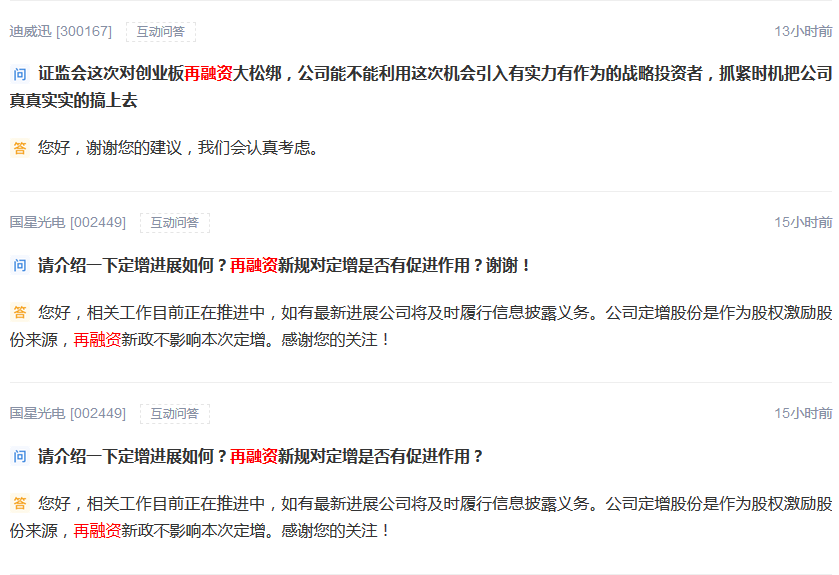 在市场情绪一片火热之下,投资者们也为上市公司操碎了心。在交易所的互动平台上频繁喊话,要求公司尽快开展再融资事宜。在过去的一周里,上证e互动涉及提问共有33条,喊话深交所公司的数量则接近200条。