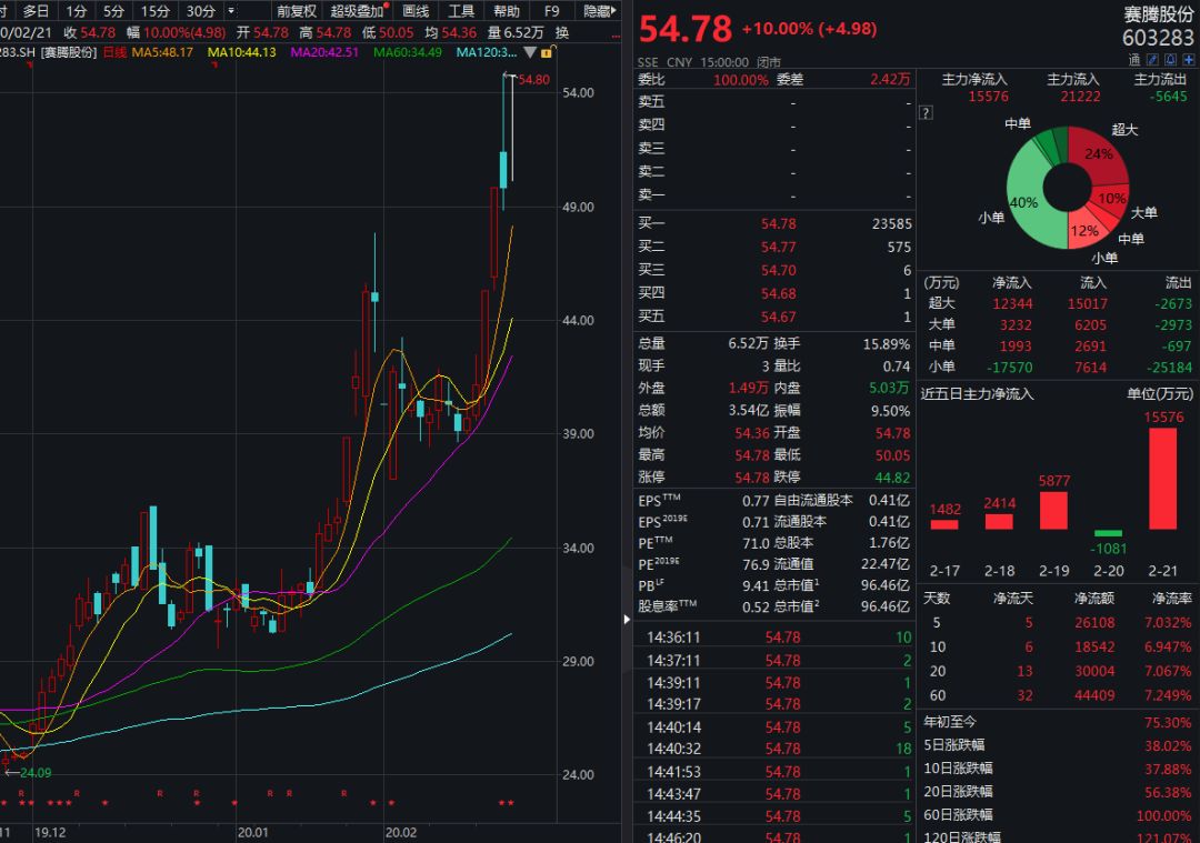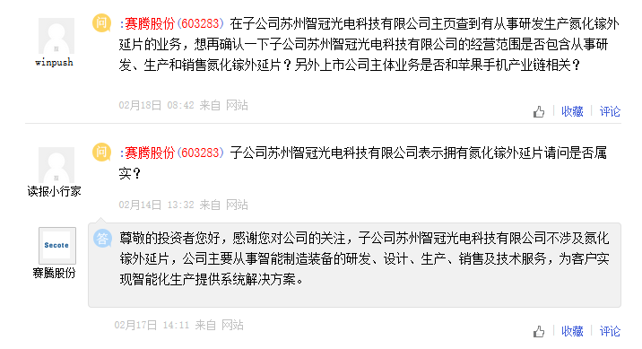 有投资者于2月14日在互动平台上留言,问询赛腾股份子公司是否拥有氮化镓外延片。虽然赛腾股份在3天后及时回复称不涉及该业务,但公司股价仍然连续涨停,并在2月19日登上龙虎榜。由于2月17日至2月19日连续三个交易日内日收盘价格涨幅偏离值累计达20%,赛腾股份为此发布股票交易异常波动公告。