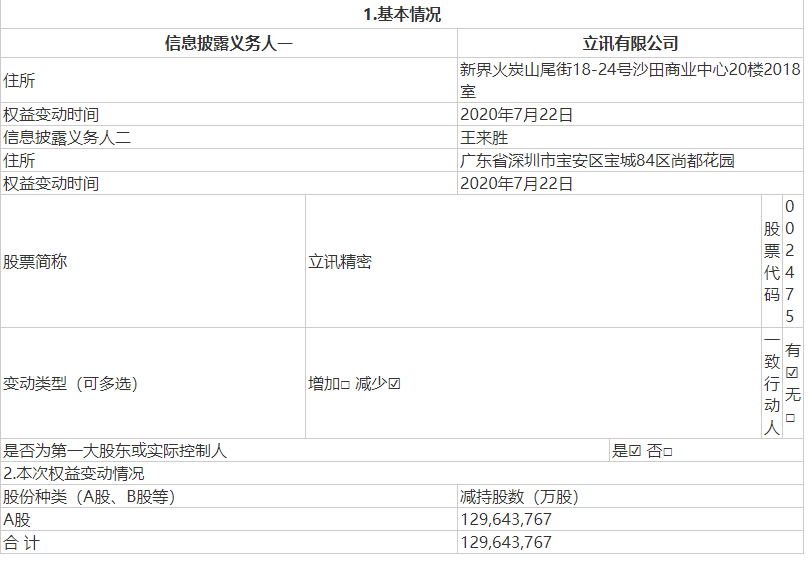 又有行业龙头股被股东大举减持。昨日晚间,立讯精密发布公告,公司控股股东立讯有限公司及其一致行动人、立讯精密实际控制人之一、副董事长王来胜于2020年7月22日通过深交所大宗交易系统减持立讯精密无限售条件流通股共计1.3亿股,占立讯精密总股本1.85%。减持资金拟主要用于偿还立讯有限银行借款及支持立讯精密相关资金需求。深交所披露的交易细节显示,公司控股股东阵营此番减持套现金额接近70亿元。