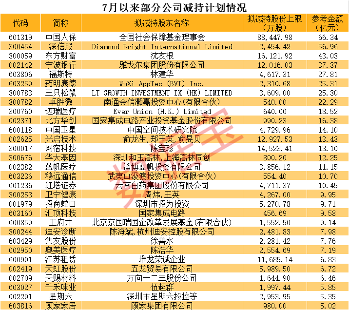 7月9日晚间,中国人保发布公告,全国社会保障基金拟减持公司A股不超8.84亿股,不超过公司总股本的2%,按最新价计算对应市值超66亿元。此外,深信服、东方财富、宁波银行等17只个股股东拟减持金额超过10亿元。