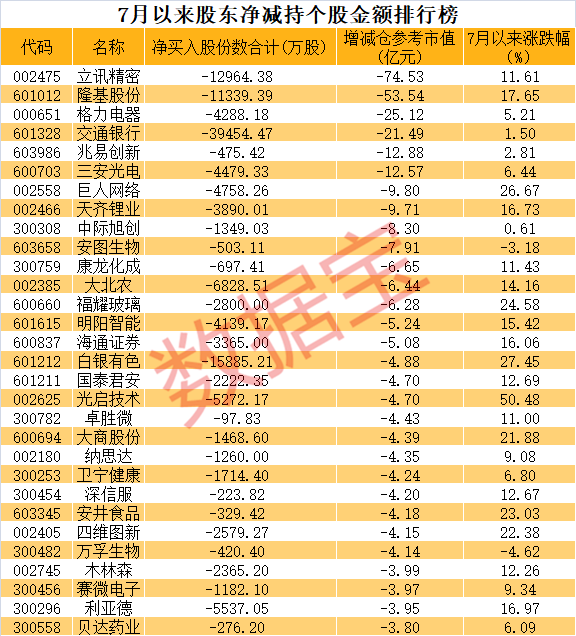 值得一提的是,减持似乎对股价影响不大。比如立讯精密7月以来股价涨超11%,隆基股份涨近18%。分析人士指出,对于有基本面支撑的个股而言,重要股东减持后,相关个股交易活跃度可能进一步提升,在消化减持之后股价可能进一步被刺激,从而形成一路减持股价一路上涨的趋势。