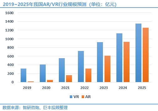 我国VR/AR产业当下也逐步趋于成熟,应用领域多分布在教育、医疗、休闲娱乐等领域。据统计,2018年我国VR/AR市场规模约为233.75亿元左右,同比增43.08%,其中VR占据主体,为227.5亿元。未来随着5G技术和政策的驱动,预计到2025年我国虚拟/增强现实技术的市场规模将分别达到1351.5亿元和1256.9亿元。