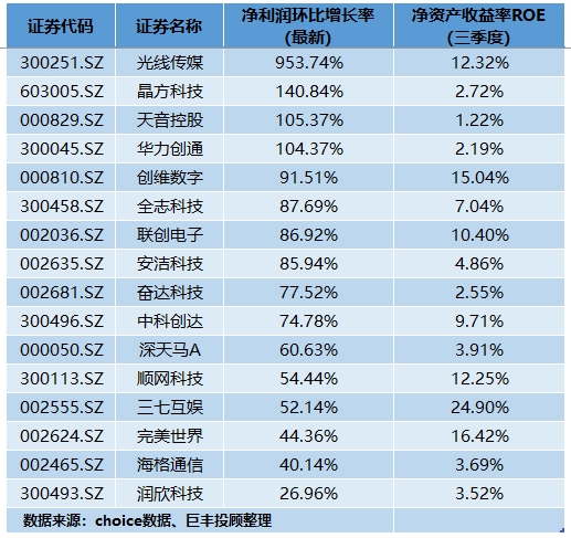 个股筛选方面,本次选择的标准主要围绕在了今年3季度净利环比增长和前三季度净资产收益率排名较高个股,并且结合技术走势,筛选了一些股价整体涨幅并不高的个股,经过整理主要有: