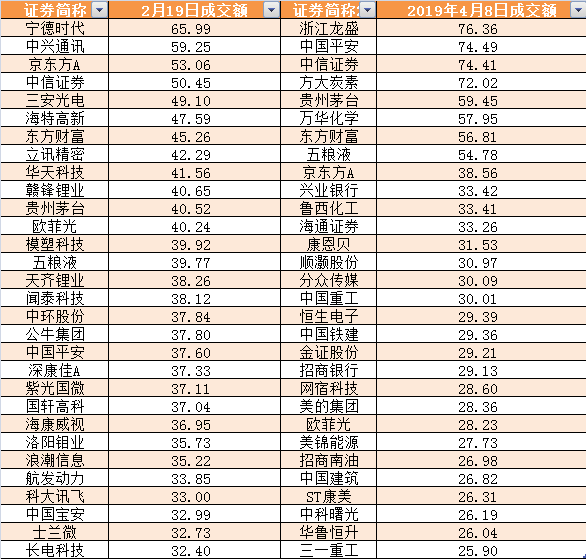 而在2019年4月8日,当日成交额超过50亿元的公司分别为浙江龙盛、中国平安、中信证券、方大炭素、贵州茅台、万华化学、东方财富、五粮液。当时成交额超过30亿元的公司只有16只,分别为浙江龙盛、中国平安、中信证券、方大炭素、贵州茅台、万华化学、东方财富、五粮液、京东方A、兴业银行、鲁西化工、海通证券、康恩贝、顺灏股份、分众传媒、中国重工。