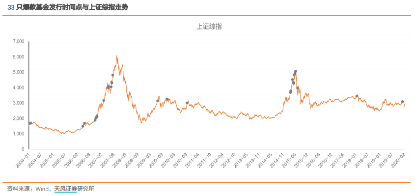 天风证券认为,从历史情况来看,爆款基金的发行与市场见顶并无直接关联:一方面,从月度基金发行总额来看,阶段性发行的高点并不和市场阶段性顶点一一对应,甚至还可能是市场阶段性底部;另一方面,通过研究33只发行总份额在100亿以上的爆款基金发行前后市场表现,仅能发现市场正处在或者接近成交额的顶部,而对于发行时间前后市场的涨跌幅表现则无明确的指向性。