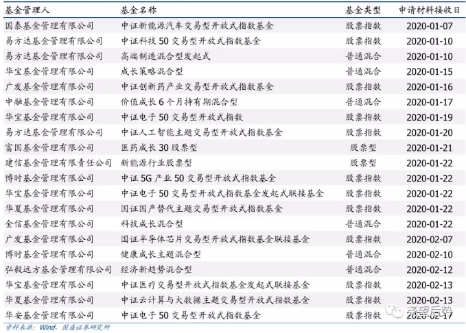 国盛证券认为,近期基金募集较为火爆,截止目前待审核及已审核未发行的偏股型基金数量还分别有194只和60只(按照最近3个月的申报情况统计),其中混合型基金占据主力,占比均达到55%以上。假设已审核未发行的60只基金在未来一到两周顺利募集发行,按照年初以来股票和混合型基金的平均发行规模(股票型基金的平均发行规模为6.6亿份,混合型为36.4亿份,另类FOF为27.6亿份)估算,未来一到两周大约还有670亿元增量资金值得期待。2020年1月以来,科技成长类基金仍有20只等待审核,其中电子与半导体主题基金5只、医疗医疗主题4只、新能源主题2只、云计算和人工智能各1只。