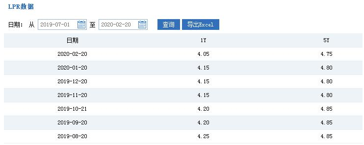 2月LPR报价出炉,中国人民银行授权全国银行间同业拆借中心公布,2020年2月20日贷款市场报价利率(LPR)为:1年期LPR为4.05%,上次为4.15%;5年期以上LPR为4.75%,上次为4.80%。以上LPR在下一次发布LPR之前有效。