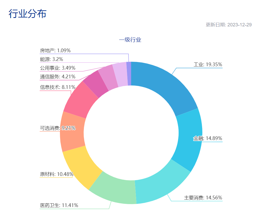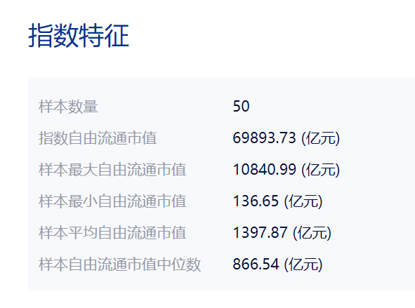 中证A50指数样本兼具大市值属性与行业表征性。截至2023年末,中证A50指数自由流通市值、样本最大自由流通市值、样本最小自由流通市值、样本平均自由流通市值、样本自由流通市值中位数分别为69893.73亿元、10840.99亿元、136.65亿元、1397.87亿元、866.54亿元。