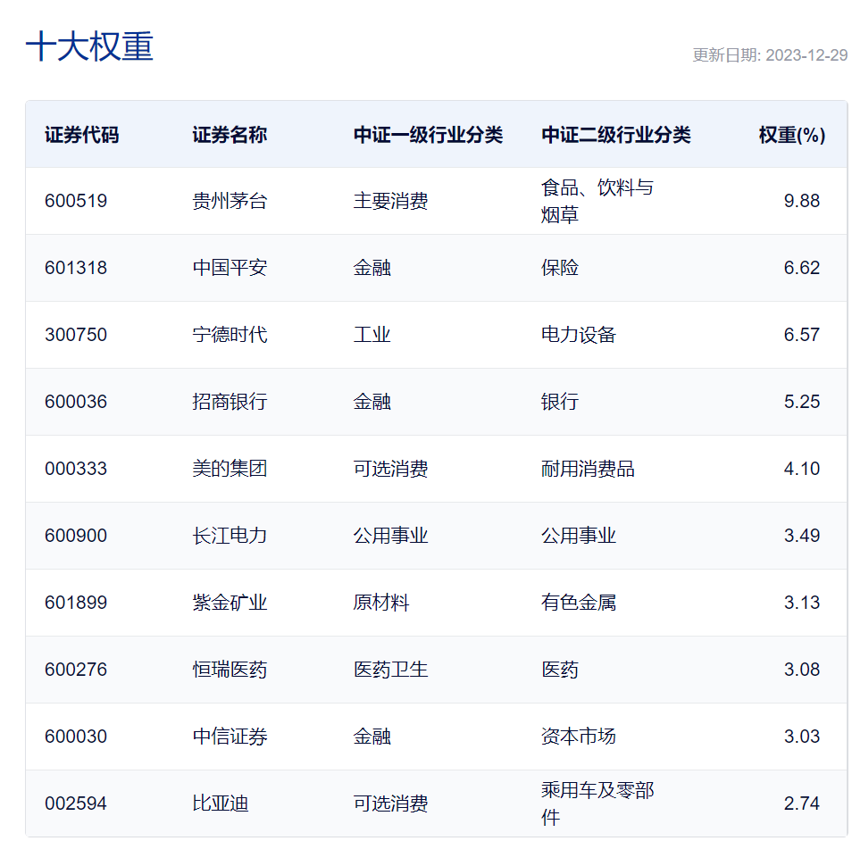 据中证指数有限公司披露,中证A50指数十大权重股分别为贵州茅台、中国平安、宁德时代、招商银行、美的集团、长江电力、紫金矿业、恒瑞医药、中信证券、比亚迪,权重比例分别为9.88%、6.62%、6.57%、5.25%、4.10%、3.49%、3.13%、3.08%、3.03%、2.74%。