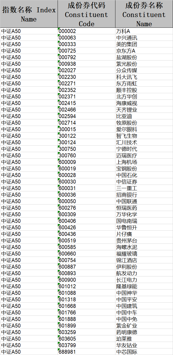 1月2日,中证A50指数正式发布。据悉,该指数从各行业龙头上市公司证券中,选取市值最大的50只证券作为指数样本,以反映各行业最具代表性的龙头上市公司证券的整体表现,这也是首个由国内指数公司编制的A50指数。万科A、比亚迪、宁德时代、贵州茅台、药明康德、中芯国际等各行业龙头均在中证A50指数成分股之列。