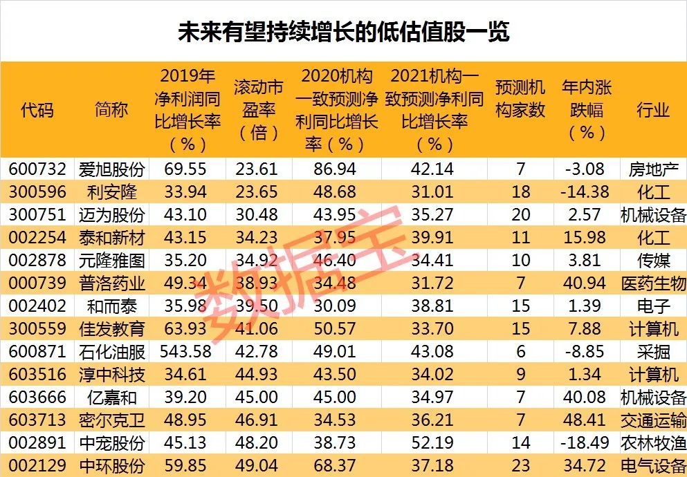 相对于过去的成长性,未来的成长性更值得观察。证券时报·数据宝从已公布的2019年年报个股中,统计出机构最青睐且预测未来2年业绩高增长、市盈率也比较低的个股,以飨读者。数据宝统计显示,2019年年报净利润增长30%以上,5家以上机构预测2020年、2021年一致净利增速均超过30%的个股中,有14只股票最新滚动市盈率在50倍以下。