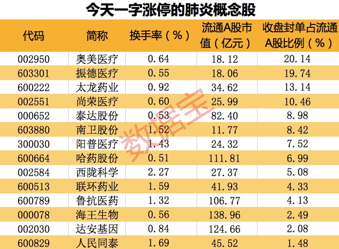 上述的3只股票可能隐藏着抗疫概念总龙头。不过,由于科创板股票只有部分投资者能够交易,数据宝重点梳理了今天“一”字涨停板的非科创板肺炎概念股,它们当中同样也可能隐藏着抗疫概念总龙头。