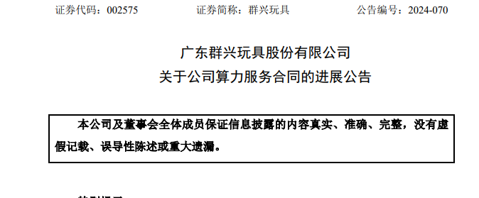 12月29日晚间,群兴玩具(002575)发布一纸关于公司算力服务合同的进展公告。