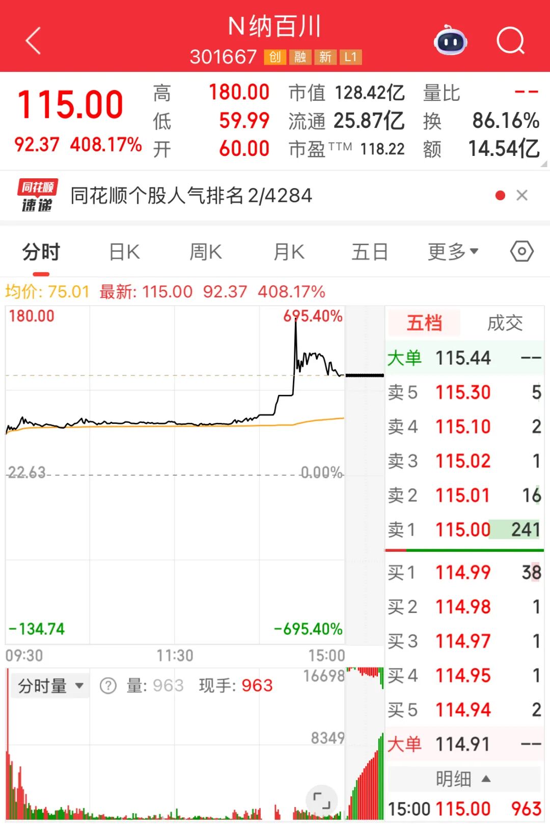 午后,新股N纳百川(301667)拉升,盘中一度涨近700%。截至收盘,涨幅回落至408%,报115元/股。
