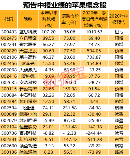 证券时报·数据宝统计显示,2020年上半年苹果产业链上市公司业绩表现较好,20家预告中报业绩的上市公司中,业绩向好的数量多达15家,占比75%。