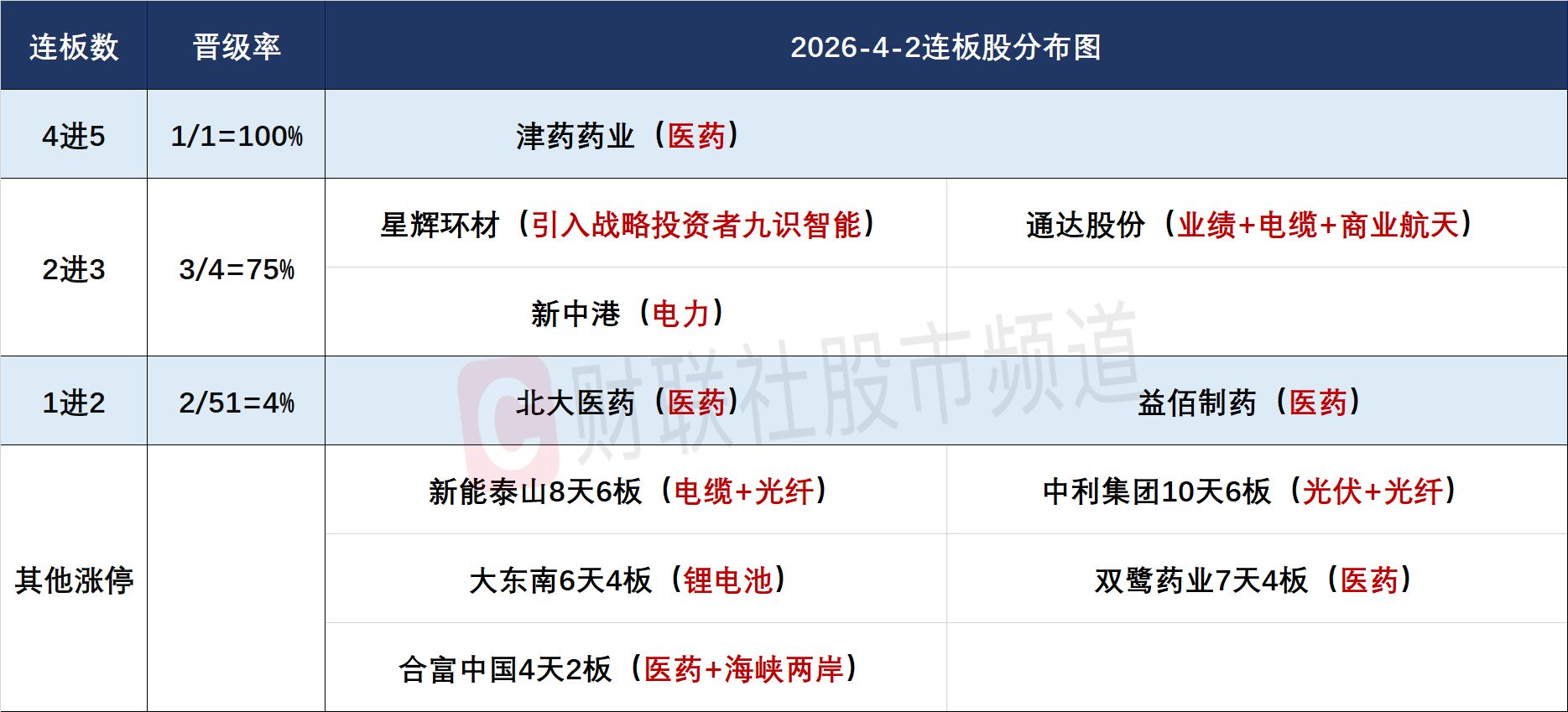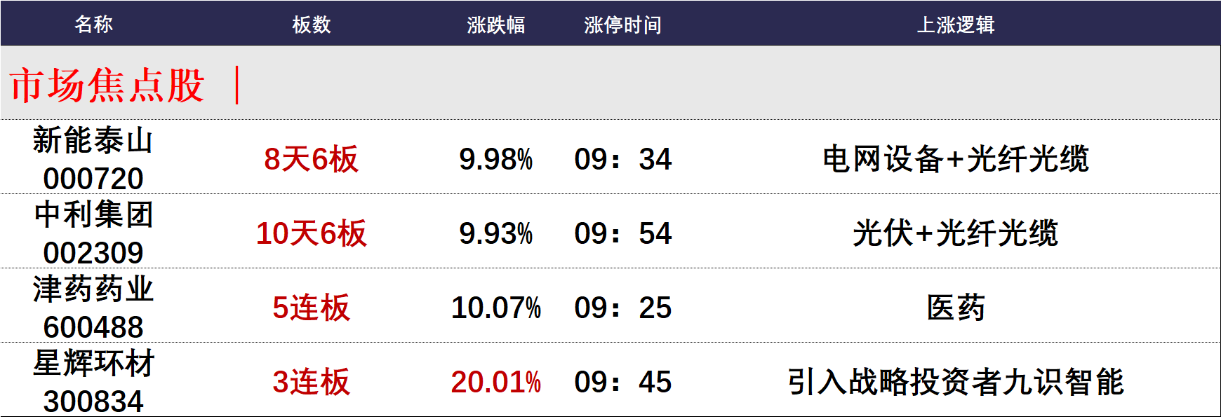 板块方面,医药板块延续强势,津药药业5连板,双鹭药业7天4板,北大医药、益佰制药2连板,北交所欧康医药30CM涨停;光纤概念股强者恒强,新能泰山8天6板、中利集团10天6板,三旺通信、长盈通涨超10%,长飞光纤一度涨停,总市值(A+H)突破2000亿,消息面上,近期黑龙江、广东、重庆等多地光纤招标集采价格大涨,相关产品处于量价齐升状态。