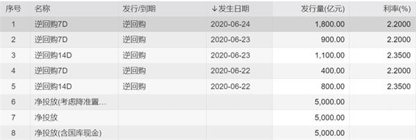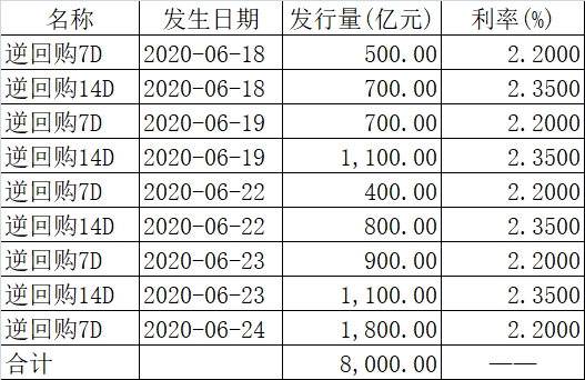 6月18日至今的5个工作日内,央行累计开展8000亿元逆回购操作。