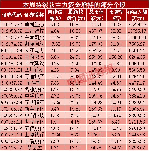 具体到个股来看,剔除近一年内次新股,本周共有61股持续获主力资金增持,合计净流入16.57亿元。其中,美尚生态、三花智控、东南网架排名三甲,净流入额分别为3.53、1.67、1.15亿元;游族网络、长江电力、招商积余、龙元建设、四川路桥、万通地产6股净流入额也较高,均在5000千万元以上;另有包括新宙邦、名雕股份、中孚信息和艾迪精密等在内的十多股净流入额均超过2000万元。