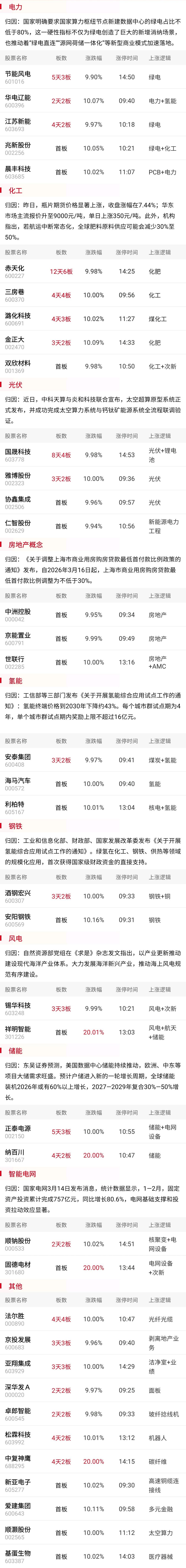 工信部等三部门发布《关于开展氢能综合应用试点工作的通知》,就近利用工业副产氢、可再生能源制氢等清洁低碳氢源,建设低碳冶金装置。受益可再生能源制氢新政,以及此前政府工作报告首次将“算电协同”写入报告内容,绿电概念卷土重来,华电辽能弱转强晋级2连板,节能风电、江苏新能、雅博股份实现反包涨停,绿色动力、浙江新能、华电新能触及涨停。此外受益低碳冶金扶持政策,钢铁板块逆势活跃,安阳钢铁、酒钢宏兴双双反包涨停,中南股份、凌钢股份早盘一度触及涨停。作为当前人气仅次于化工的绿电板块,其同时与储能、算力、氢能等领域的交集,仍容易成为几大方向聚集的一大载体,且板块内抱团人气股仍层出不穷,仍是短线抱团资金绕不开的核心方向之一。而钢铁板块近期的补涨动作,或预示着市场当前的聚焦重点仍集中于低价、超跌两大属性,能否进一步带动整个低价股群体的活跃也值得期待。