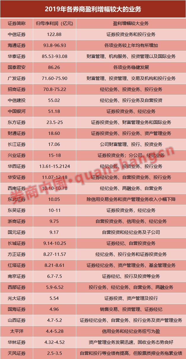 至少有25家券商在业绩预增原因中都表述,经纪业务或财富管理业务盈利增幅较大。比如华泰证券表示,A股市场整体回暖,沪深股票市场主要指数上行,两市交投活跃,融资规模显著增长,通过坚定推进科技赋能下的“双轮驱动”发展战略,财富管理、机构服务、投资管理以及国际业务等主要业务线收入均实现同比增长;中国银河表示,2019年,公司把握市场机遇,坚定推进业务转型,优化大类资产配置,证券投资业务收入、经纪业务收入均较上年实现较大幅度增长。
