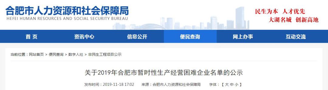 e公司记者注意到,《关于2019年合肥市暂时性生产经营困难企业名单的公示》发布于11月18日下午5点。