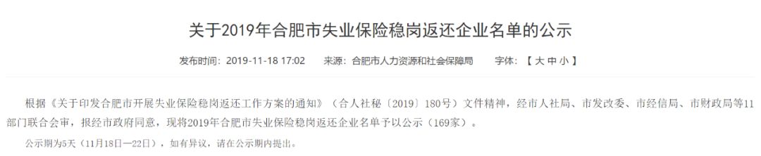 合肥市人社局在公示中指出,根据《关于印发合肥市开展失业保险稳岗返还工作方案的通知》(合人社秘〔2019〕180号)文件精神,经市人社局、市发改委、市经信局、市财政局等11部门联合会审,报经市政府同意,现将2019年合肥市暂时性生产经营困难企业名单予以公示(169家)。(169家具体名单见文末)