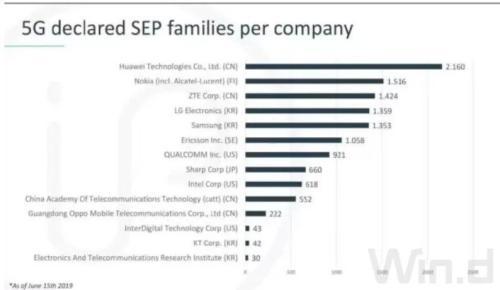 德国专利数据公司IPIytics发布的最新5G专利排行榜显示,华为共获得了2160个相关专利,排名第一。(参见下图)