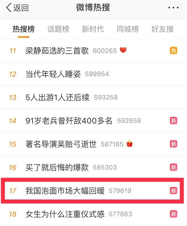 “方便面+火腿肠+榨菜”的温暖组合,在成为绿皮火车的遥远记忆后,又成为这个中秋节踏上团圆之旅的游子们,在高铁上新的温馨回忆。随着方便面的再次流行,9月14日,“我国泡面市场大幅回暖”甚至登上了微博热搜。