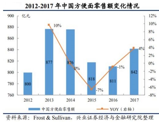 兴业证券认为,方便面市场的衰退有三方面原因:一是,随着居民健康意识的提高,对方便面的需求降低;二是,外卖市场的迅速崛起对方便面市场造成冲击;三是,外出务工人员增速的下滑和高铁的快速发展,使得方便面两大消费群体萎缩。