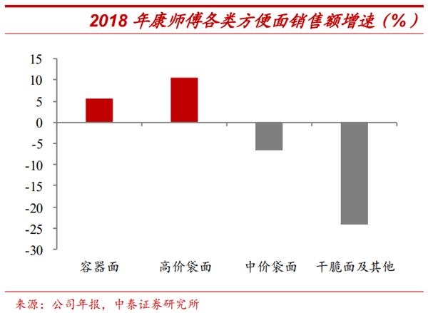 高端方便面也成为方便面复苏的先头部队。中泰证券指出,2018年康师傅容器面和高价袋面销售额明显正增长,而中价袋面和干脆面等平价的产品反而是负增长的。也就是说,康师傅方便面收入的增速都是价格较高的容器面和高价袋面贡献的。