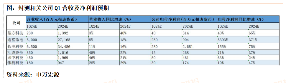 根据申万宏源,通富微电Q1及全年业绩增速预期在封测领域中独占鳌头,Q1及全年净利润分别增长5393%、371%,不过也要注意,通富微电2023Q1净利润基数比较低,Q1预期约53倍的增长幅度被过于放大,根据公司此前公布的业绩预告,2023全年公司净利润下滑64%-74%,所以其全年预期的增长371%增速也不能过于放大,反而观察营业收入增速比较客观,通富微电全年营业收入预期增长18%,根据公司财报,去年前三季度营业收入仅增长3.84%,今年营业收入18%的预期,较去年同期增幅还是有比较明显的提升。