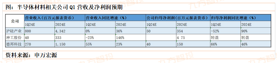 半导体材料领域,根据申万宏源,神工股份、德邦科技Q1净利润将实现增长,全年来看沪硅产业、神工股份、德邦科技三家或均实现增长。不过,我们对于半导体材料方面跟踪不多,主因国产厂商整体渗透率还不高,目前为止行情还是以情绪为主。