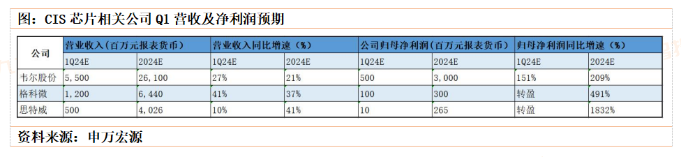 近期华为P70相关预期比较热,韦尔股份旗下豪威科技的CIS芯片OV50H被供应链人士透露可能进入P70供应链,如果相关消息属实,那么CIS国产产业链有望受到提振。同时,考虑到2022-2023年CIS产业链去库存阶段资产减值幅度比较大,该产业链已经逐渐出清,而伴随着国产手机销量高歌猛进,以及华为、小米等对国产CIS的认可度提升,国产CIS厂商有望在今年迎来盈利拐点。以下,是申万宏源对韦尔股份、格科微、思特威三家主要的国产CIS厂商营业收入、净利润预测,根据该预测,韦尔股份今年营收将增长21%。
