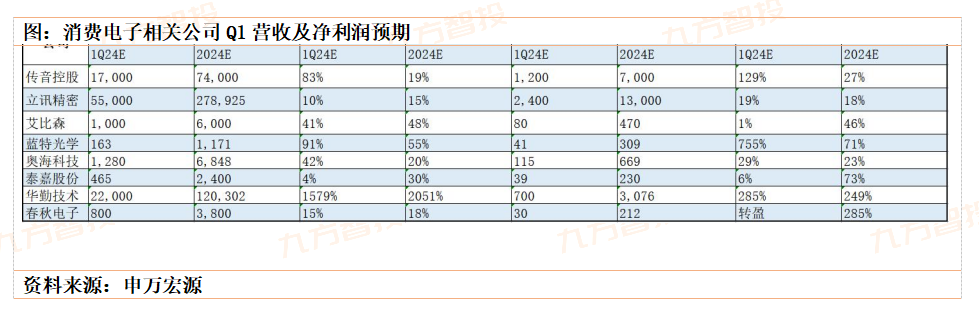 根据申万宏源对消费电子相关公司Q1业绩预测,我们看到像传音控股、蓝特光学、华勤技术等Q1净利润或保持较高增速,如立讯精密这种代工龙头,依然稳中向好,春秋电子可能扭亏为盈。不过,我们也要知道,今年行业整体高增速是在去年基数比较低的情况下实现的,2023年全年营收下滑是整个行业的大环境所致,而2024年随着行业触底,消费电子领域营收可能拐头,至于这轮复苏有多强,就要看本轮经济复苏的持续性和力度了。