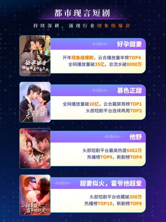例如2024年,阅文集团推出的精品短剧《万道龙皇》72小时内流水超千万,女频赛道的精品短剧《叮!我的首富老公已上线》48小时内流水突破1200万。再到2025年,阅文又推出开年现象级爆款《好孕甜妻》《他野》《甜妻似火,霍爷他超爱》《庶女以身入局》《离家后我带着女儿涅槃重生》等多元化多题材爆款作品。