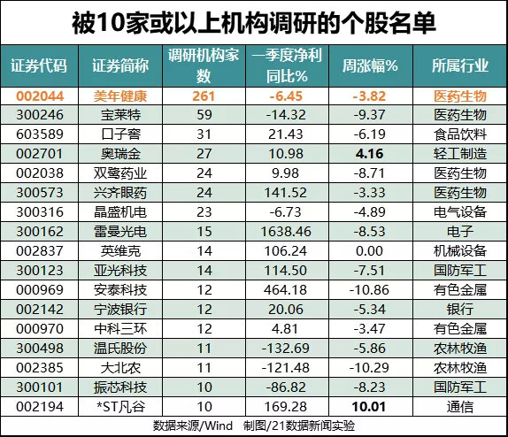 接待机构数量方面,美年健康(002044.SZ)成为最受机构青睐的公司,共计接待了261家机构。