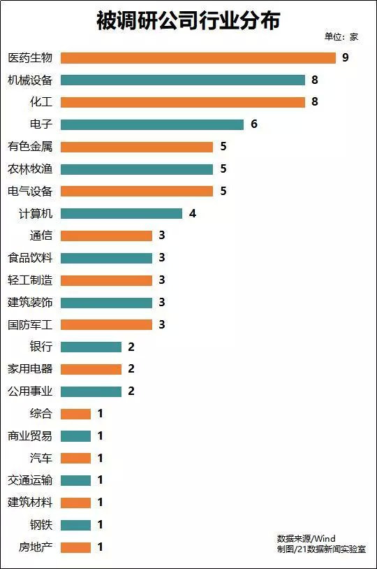从行业分布来看,过去一周医药生物行业最受机构青睐,相关调研公司有9家。其次是机械设备、化工行业均有8家公司获调研。